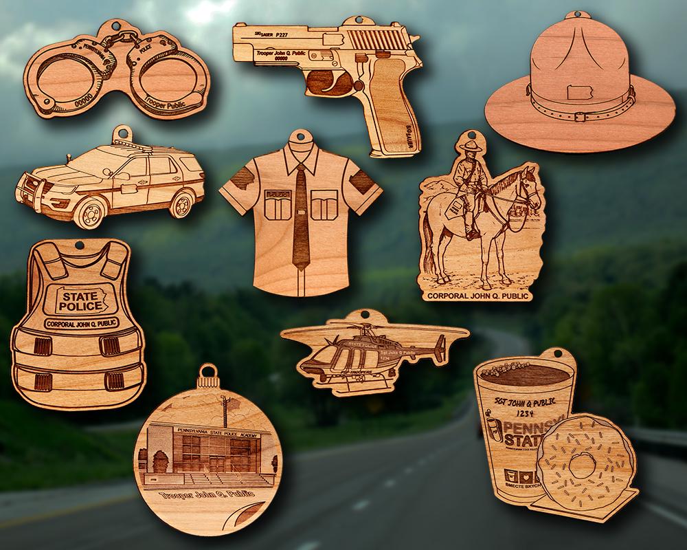 Wooden Pennsylvania Police Generic Ornaments. Great for honoring the Pennsylvania Police Officers and employees. Ornaments are approximately 4" in the longest direction. When you place your order, please include any personalization if applicable, this can be input in the Personalization section or in the checkout section where it says, "Note to Seller".