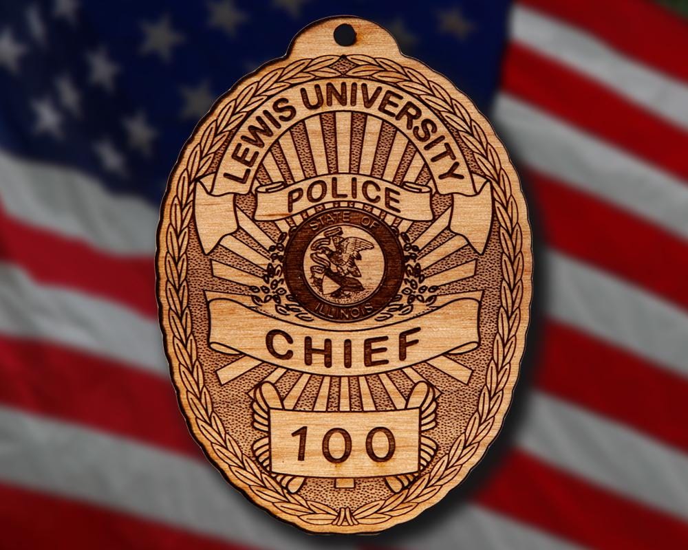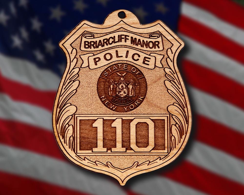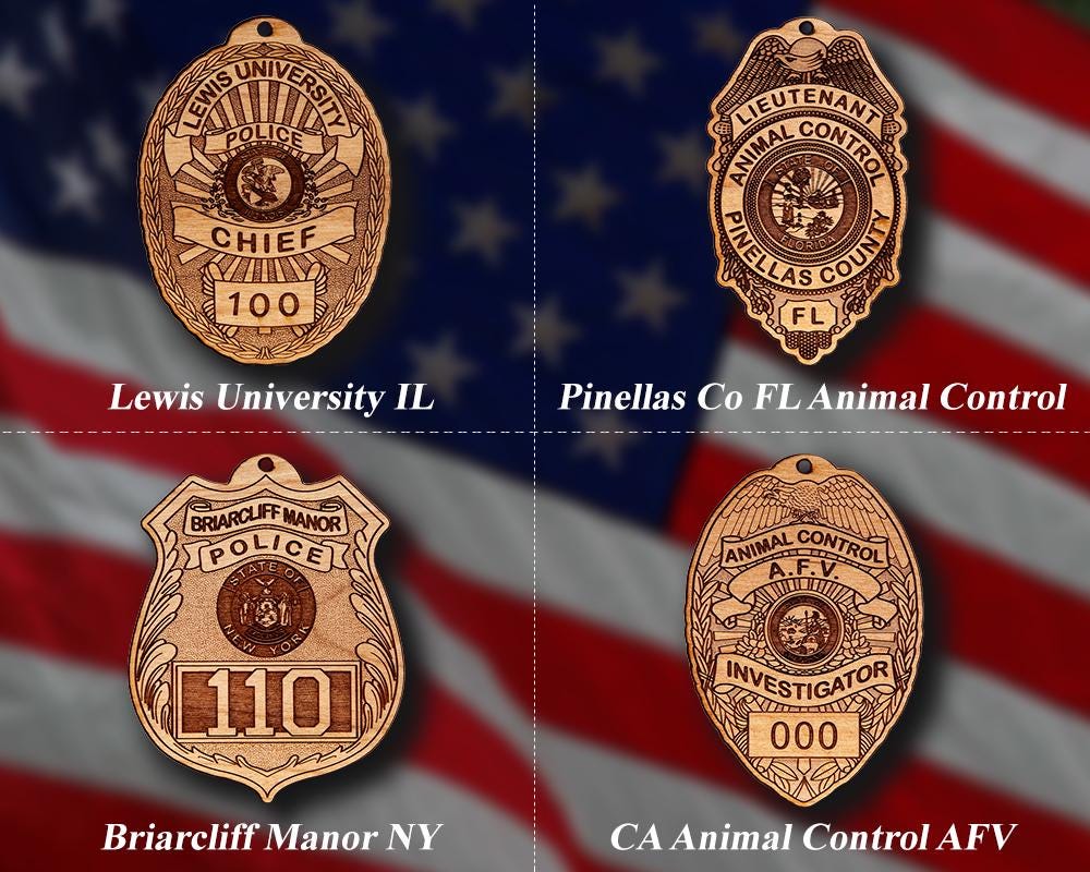 Wooden Miscellaneous Police Badge or Patch Ornament. Great for honoring your local police officer and employees, also makes a great promotion or retirement gift. Ornaments are solid wood and approximately 4" in the longest direction. When you place your order, please include the badge number and /or rank etc. if applicable.