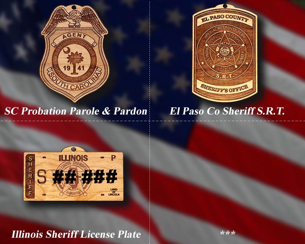 Wooden Miscellaneous Police Badge or Patch Ornament. Great for honoring your local police officer and employees, also makes a great promotion or retirement gift. Ornaments are solid wood and approximately 4" in the longest direction. When you place your order, please include the badge number and /or rank etc. if applicable.