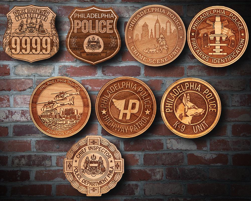 Wooden Philadelphia Badge or Patch Plaque. Great for honoring the Philadelphia police officer and makes a great retirement gift. Plaque are solid wood and approximately 11" tall. When you place your order for a badge please include the badge number.