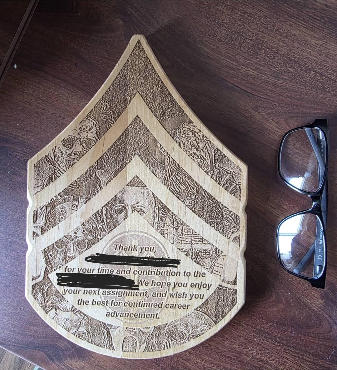 Amazing quality for a PCS/Going Away plaque! It was quickly crafted and shipped fast!