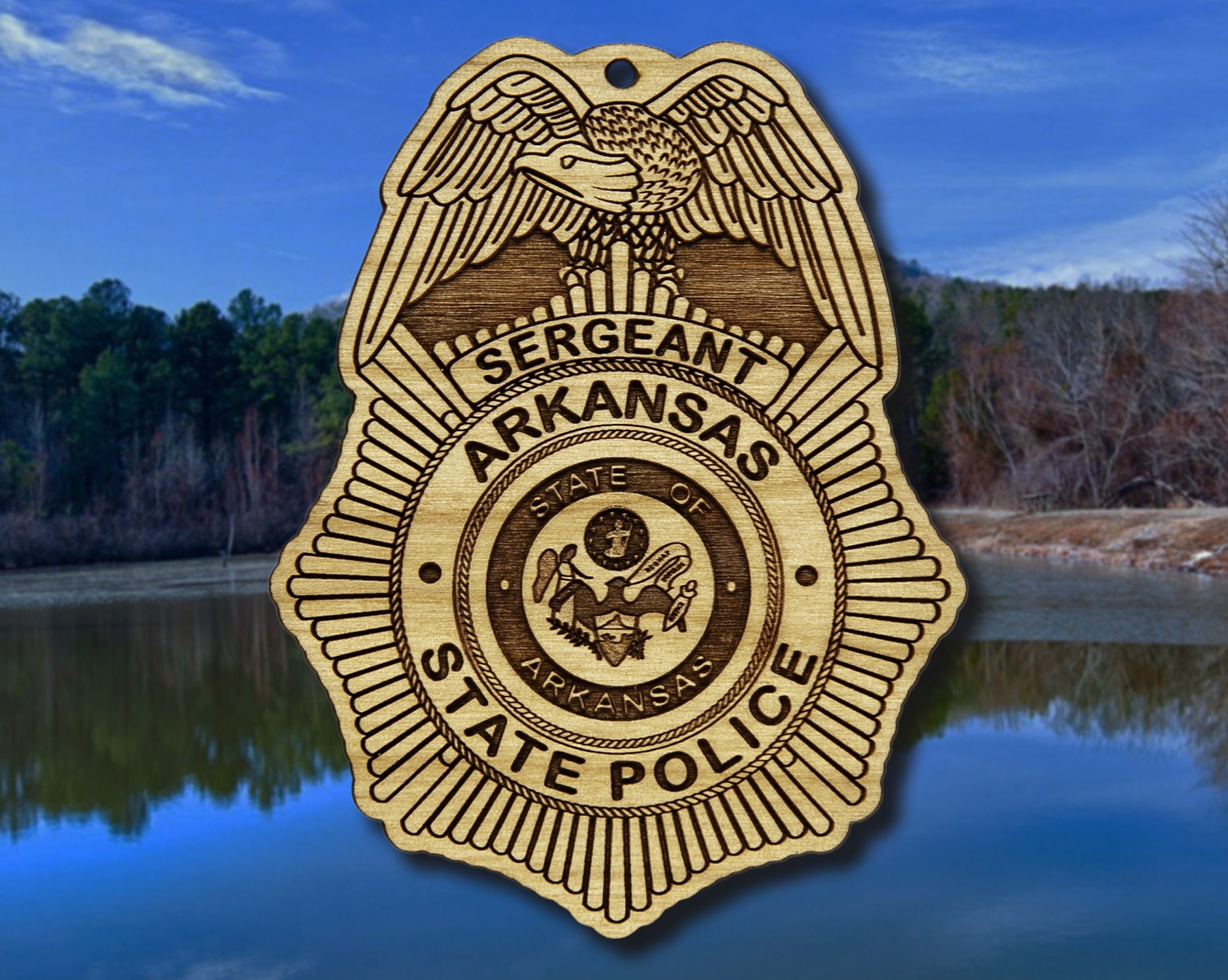 Wooden Arkansas State Police Badge or Shoulder Patch Ornament. Great for honoring the Arkansas State Police Troopers and employees. Ornaments are approximately 4" in the longest direction. When ordering the badge be sure to note the drank and badge number. ou can enter information in the "Personalization" section or in the checkout process where it says "Note to seller"